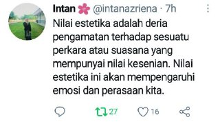 Hari ini saya nak kongsikan tentang post terbaru saya di lama sosial twitter tentang nilai estetika. Saya juga akan kongsikan beberapa perkongsian post yang telah dibuat oleh rakan-rakan saya yang lain. Kami telah berkongsi tentang maksud nilai estetika yang pasti dapat difahami oleh semua. Jadi di sini saya sertakan beberapa post dari kawan-kawan saya dan juga post saya sendiri.